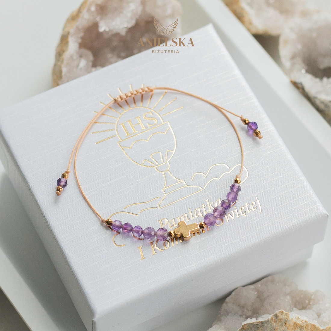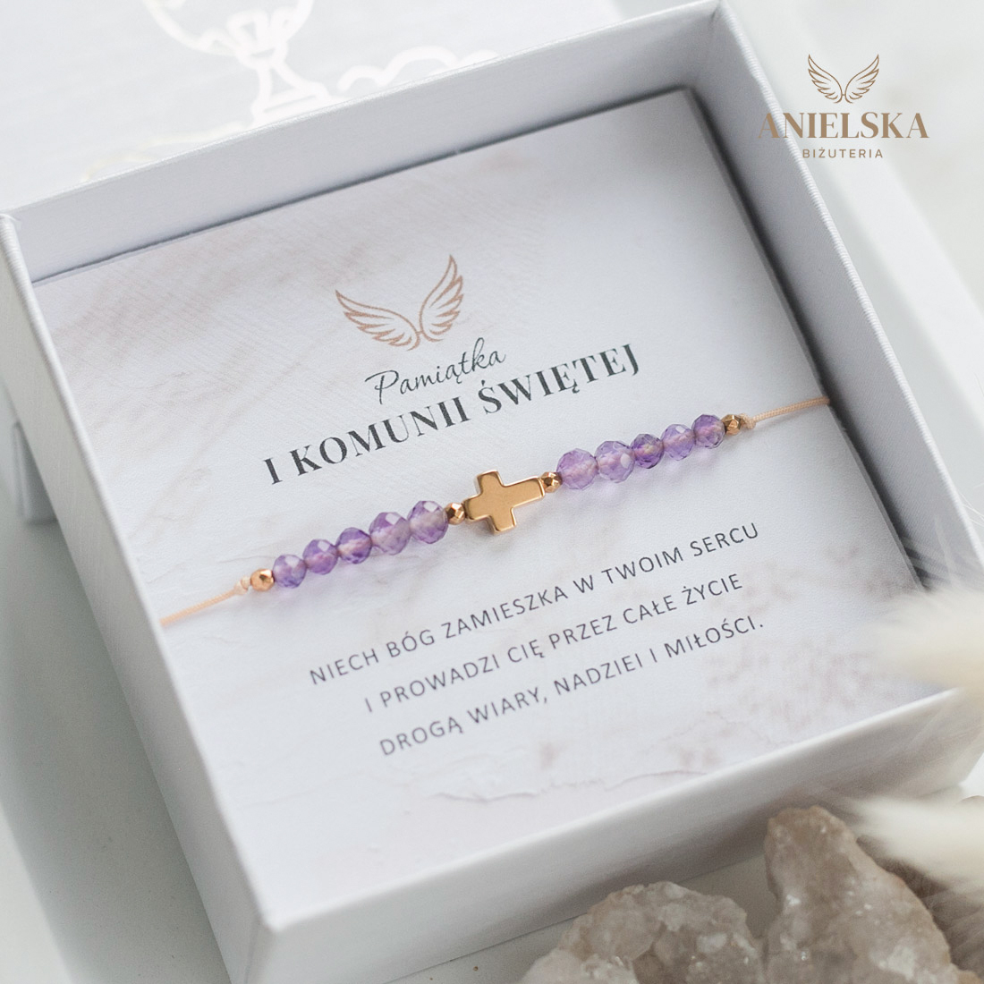 Pamiątka Pierwszej Komunii Świętej – Bransoletka Ametyst z Krzyżykiem Pierwsza Komunia Święta